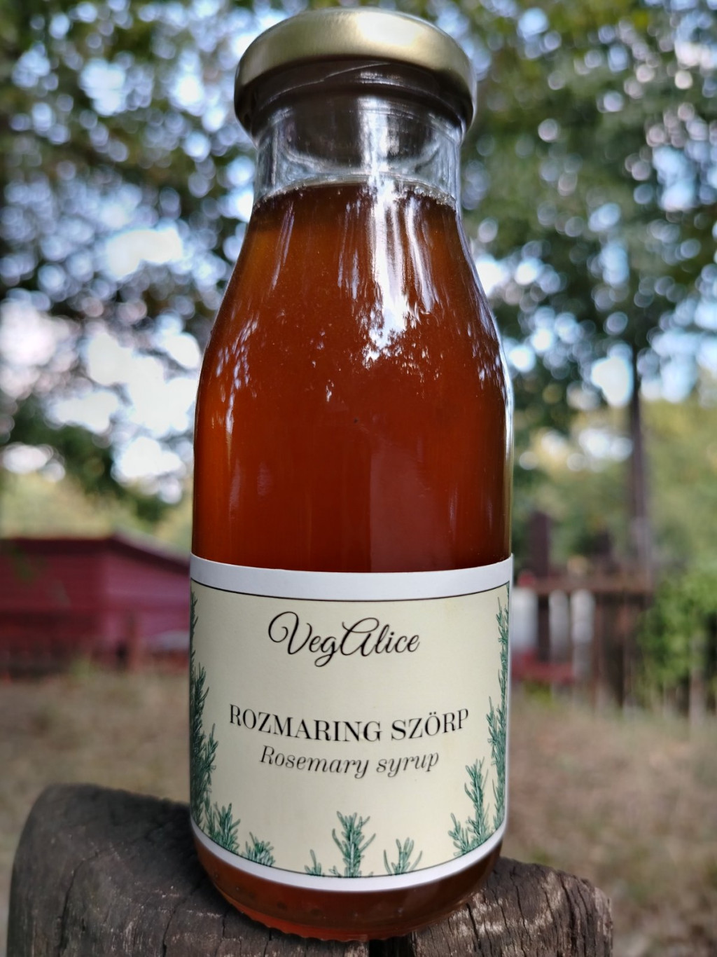 Saját kertemben termett, vegyszermentes rozmaringból, cukorral készült, 2025-ös Magyar Ízek versenyén arany minősítést szerzett szörp.