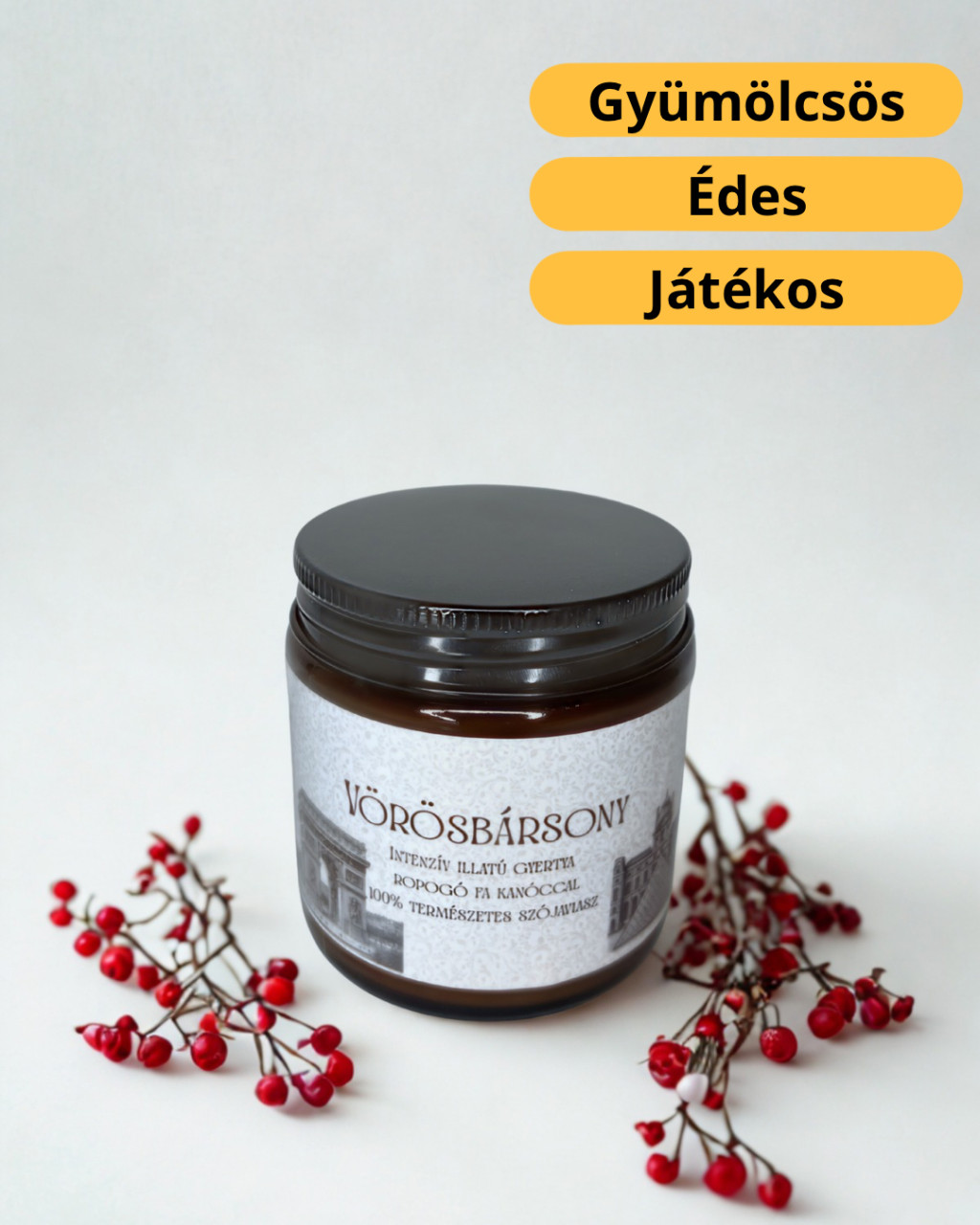 Illatleírás: Gyümölcsös-fűszeres jegyek találkoznak egy elegáns, luxus érzetű alapillattal – határozott, mégis romantikus. egy elegáns, luxus érzetű alapillattal – határozott, mégis romantikus. Összetevők: 100% természetes szójaviasz Kiváló minőségű illatolaj Ropogó fa kanóc Ftalátmentes Minden összetevő vegán és állatkísérlet-mentes Figyelmeztetés: Soha ne hagyd felügyelet nélkül az égő gyertyát! Gyermekektől és háziállatoktól elzárva tárold és használd! Az égő gyertyát mindig hőálló felületre helyezd! A kanócot minden használat előtt vágd vissza kb. 5 mm hosszúra! Használati útmutató: Az első égetéskor hagyd, hogy a viasz teljesen elolvadjon a gyertya széléig (ez megelőzi a kráteresedést). Soha ne égesd egyhuzamban 3–4 óránál tovább. Használat után várd meg, míg teljesen kihűl, mielőtt újra meggyújtanád. A fa kanóc esetében normális, ha enyhe pattogást hallasz – ez adja meg a különleges hangulatát. További információ a gyertyáról: Nettó tömeg: 100 g Égési idő: kb. 20-25 óra (függ a környezeti tényezőktől és a gyertya gondozásától)