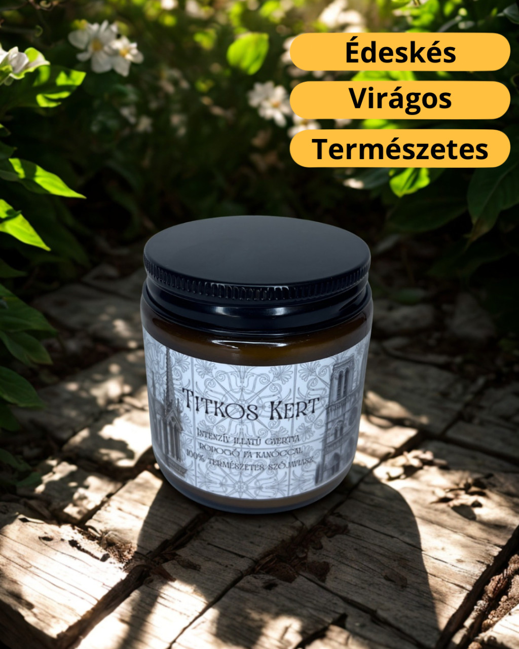 Illatleírás: Édeskés, friss és természetes.A titkos kert virágos illata egy napsütötte kert hangulatát hozza el, könnyed és vidám aromával. Összetevők: 100% természetes szójaviasz Kiváló minőségű illatolaj Ropogó fa kanóc Ftalátmentes Minden összetevő vegán és állatkísérlet-mentes Figyelmeztetés: Soha ne hagyd felügyelet nélkül az égő gyertyát! Gyermekektől és háziállatoktól elzárva tárold és használd! Az égő gyertyát mindig hőálló felületre helyezd! A kanócot minden használat előtt vágd vissza kb. 5 mm hosszúra! Használati útmutató: Az első égetéskor hagyd, hogy a viasz teljesen elolvadjon a gyertya széléig (ez megelőzi a kráteresedést). Soha ne égesd egyhuzamban 3–4 óránál tovább. Használat után várd meg, míg teljesen kihűl, mielőtt újra meggyújtanád. A fa kanóc esetében normális, ha enyhe pattogást hallasz – ez adja meg a különleges hangulatát. További információ a gyertyáról: Nettó tömeg: 100 g Égési idő: kb. 20-25 óra (függ a környezeti tényezőktől és a gyertya gondozásától)