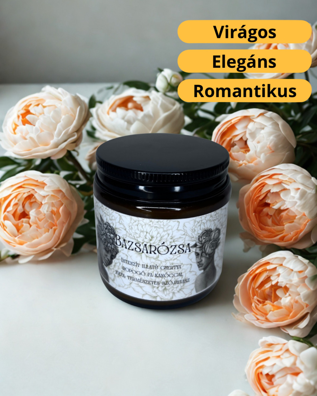 Illatleírás: Friss, virágos és nőies illat.A bazsarózsa lágy szirmai egy enyhén púderes, tiszta alapra simulnak.Elegáns, világos és igazán romantikus. Összetevők: 100% természetes szójaviasz Kiváló minőségű illatolaj Ropogó fa kanóc Ftalátmentes Minden összetevő vegán és állatkísérlet-mentes Figyelmeztetés: Soha ne hagyd felügyelet nélkül az égő gyertyát! Gyermekektől és háziállatoktól elzárva tárold és használd! Az égő gyertyát mindig hőálló felületre helyezd! A kanócot minden használat előtt vágd vissza kb. 5 mm hosszúra! Használati útmutató: Az első égetéskor hagyd, hogy a viasz teljesen elolvadjon a gyertya széléig (ez megelőzi a kráteresedést). Soha ne égesd egyhuzamban 3–4 óránál tovább. Használat után várd meg, míg teljesen kihűl, mielőtt újra meggyújtanád. A fa kanóc esetében normális, ha enyhe pattogást hallasz – ez adja meg a különleges hangulatát. További információ a gyertyáról: Nettó tömeg: 100 g Égési idő: kb. 20-25 óra (függ a környezeti tényezőktől és a gyertya gondozásától)