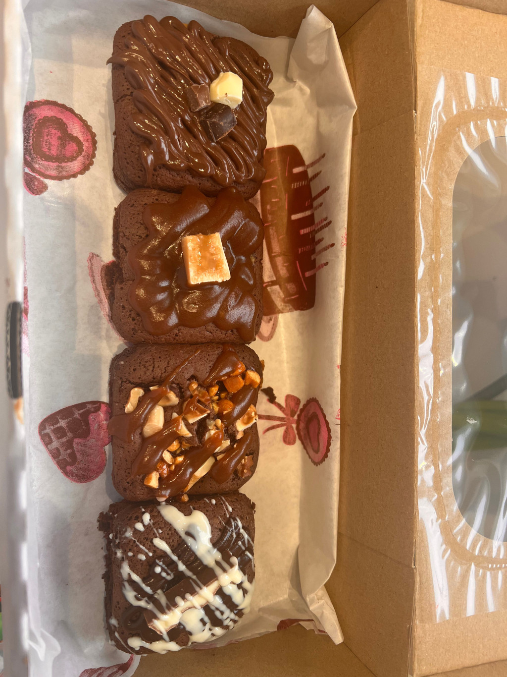 Brownie box tartalma: -1db Kinder csokis -1db Karamellás -1db Magvas-Karamellás -1db Triplacsokis-Nutellás