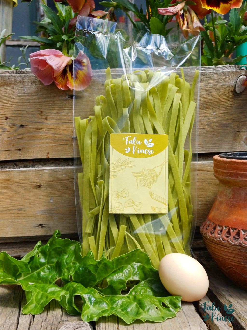 Kertemben termett zöld mángold levelével színezett, tyúktojásos száraz tészta.